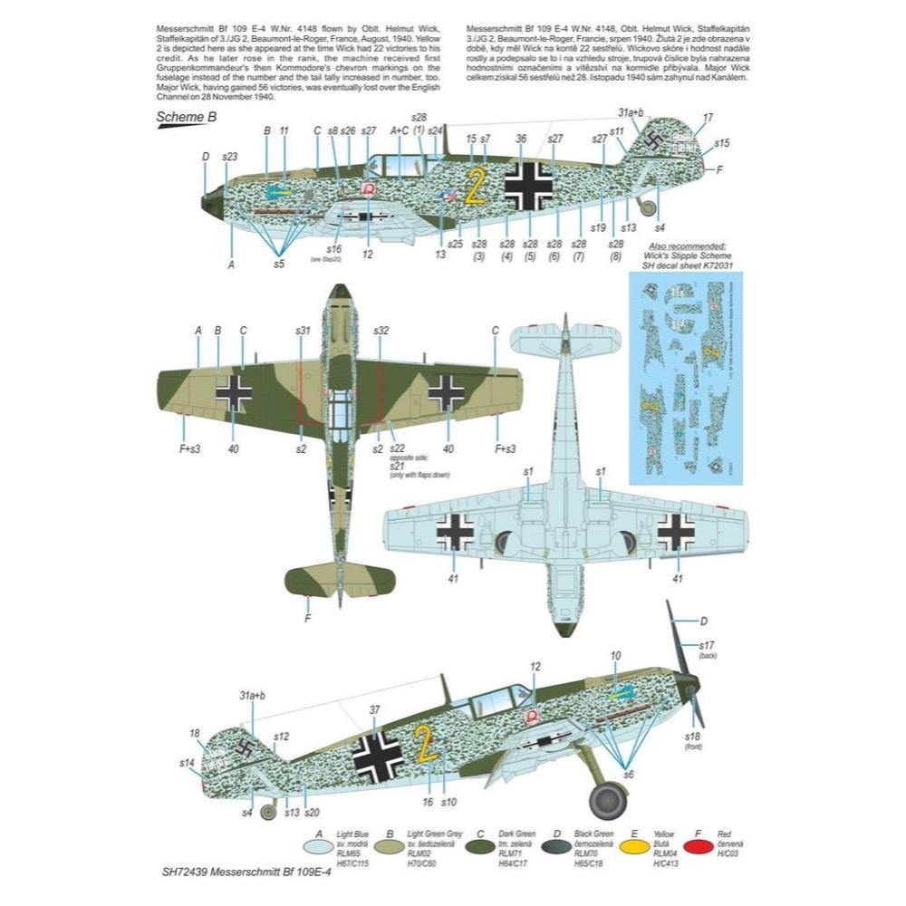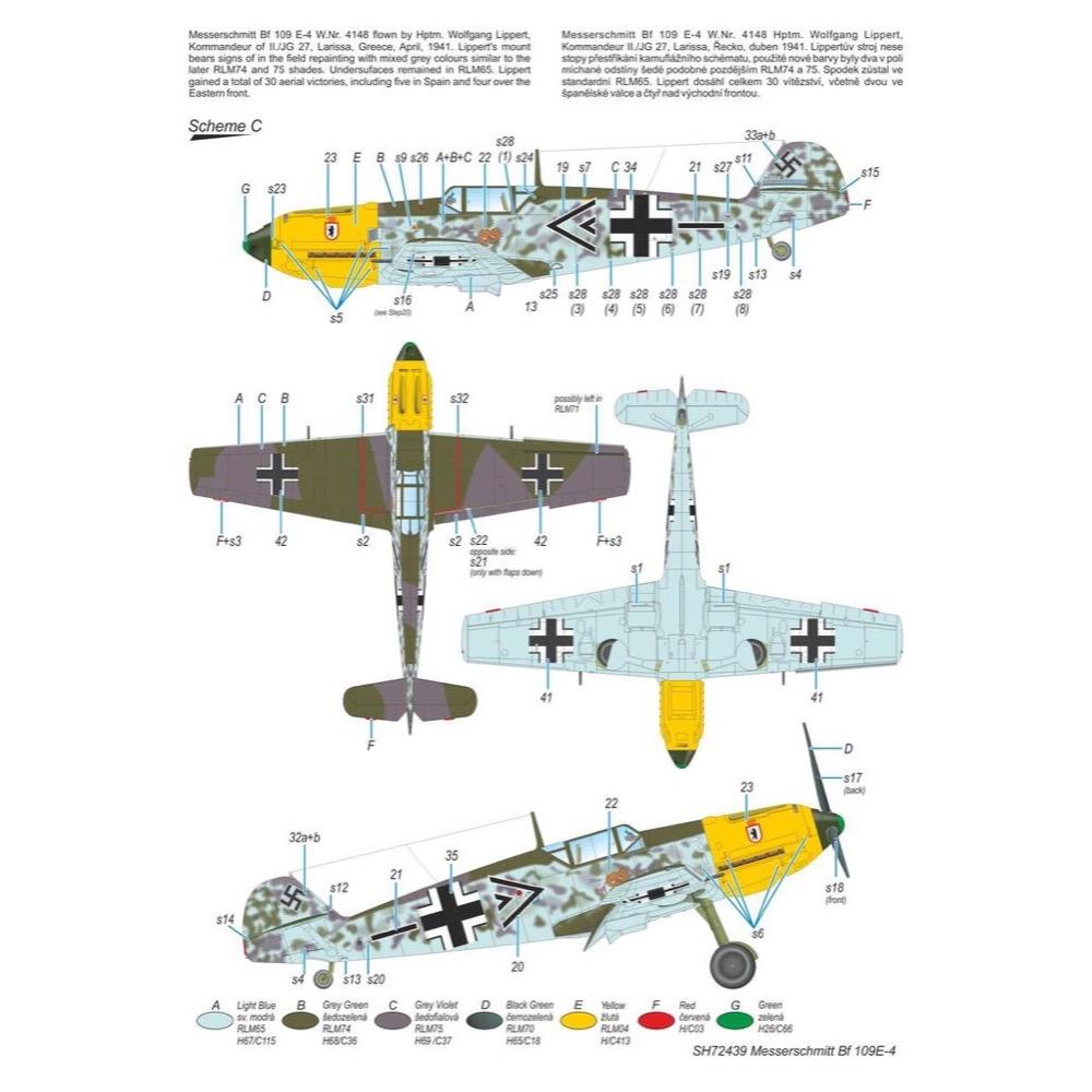 This month´s hot topic is the cannon-armed version, the Bf 109E-4, model cat.no. SH72439. The kit bring schemes of two German fighter aces, G.Schopfel and H.Wick who, flying from bases in Western Europe, took part in the Battle of Britain. The kit also contains two more options, these being Emils as operated over the Balkans a year later. Decals of Wick´s machine contain also the fuselage camouflage mottles consisting of a myriad of tiny brush-made blotches. The kit parts are laid out into two grey styrene sprues and one with clear parts. The kit offer the option to build the Emil either with the engine and fuselage machine guns cover panels open or closed. The wing flaps and slats can be posed in the down position, ailerons offer the option as well.