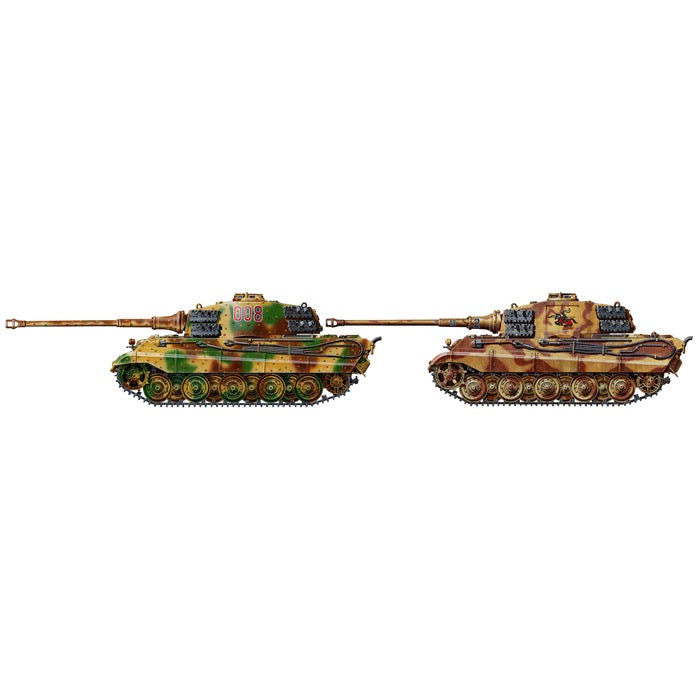 In order to counter the increasing threat of Russian tanks during the latter part of WWII, Germany began developing a new heavy tank, the King Tiger. The first 50 models featured a Porsche designed turret, however in mass production runs a Henschel design turret was adopted. Designed for defense and attack, the King Tiger featured thick 150mm armor on the front and 80mm armor on the sides, and a 88mm L71 high velocity main gun capable of penetrating 170mm thick armor at a distance of 1,000m. Auxiliary armament included two 7.92mm machine guns mounted on the front hull section and on the turret. The extremely thick armor on the turret front measured 185mm and 88mm on the side panels.This massive tank was driven by a 700hp Maybach HL230 P-30 12 cylinder liquid cooled engine.