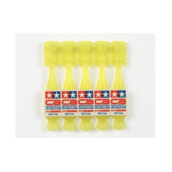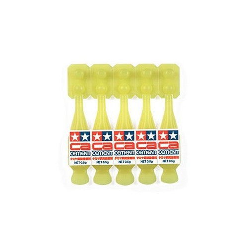 Tamiya has now packaged CA cement in smaller 0.5g tubes that can be conveniently used in one time, thereby eliminating waste. It can be used with plastics, metal, and synthetic parts for quick application.