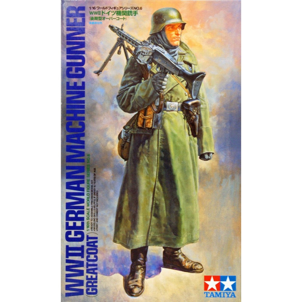 This is a plastic assembly kit model of a WWII German machine gunner wearing a greatcoat and shouldering a MG42 machine gun. The coat features separate parts to depict a wider collar and hems to provide the model with greater realism. Equipment such as the MG42 machine gun and gas mask case have a detailed finish.