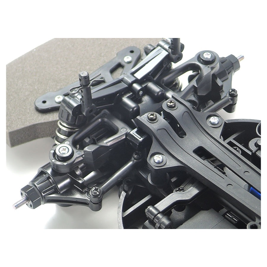 The bathtub frame of the evolved shaft-driven 4WD TT-01 Type-E has its motor and battery close to the ground for lower center of gravity and optimum balance. Mounted on the bathtub frame is a fiberglass reinforced nylon upper deck and gear covers improving rigidity, as well as a 3-piece tie rod providing smooth steering action. The low center of gravity, highly balanced design, 4-wheel double wishbone suspension system, and front and rear differential gears all come together to produce an excellent driving experience.