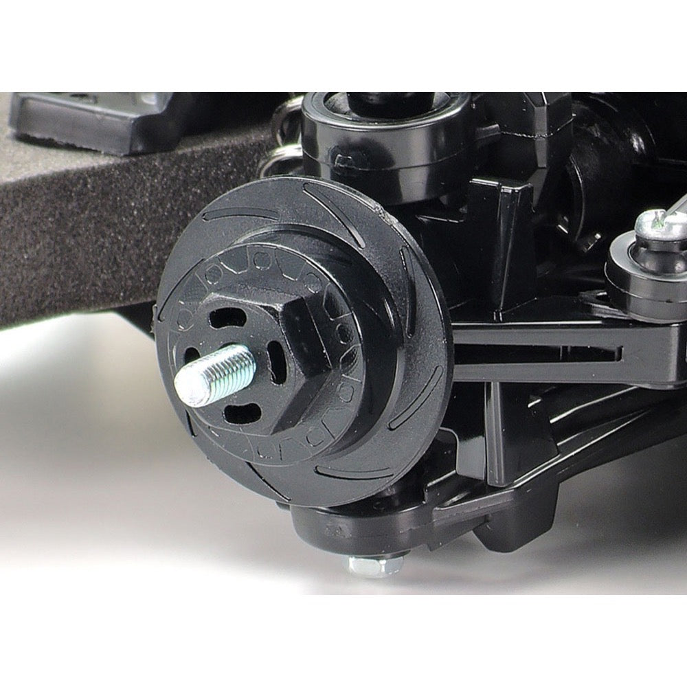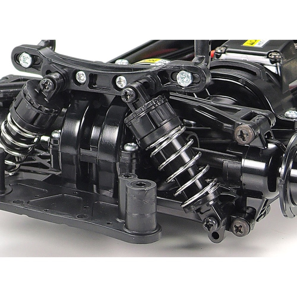 The TT-02 chassis, with its adaptable and balanced shaft-driven 4WD system, ensures excellent stability through a longitudinal layout featuring the battery on the left and the motor on the right. Its design incorporates identical left and right suspension arms and uprights for straightforward assembly, along with easily maintainable gearboxes. The chassis offers versatility with two wheelbases, two ground clearance settings, two tread setups, and a selection of ten gear ratios. Not only functional, it boasts aesthetic appeal with brake disc-shaped wheel hubs, stylish front bumper supports, gun metal color 10-spoke wheels, and sleek slick tires, delivering a sporty appearance.