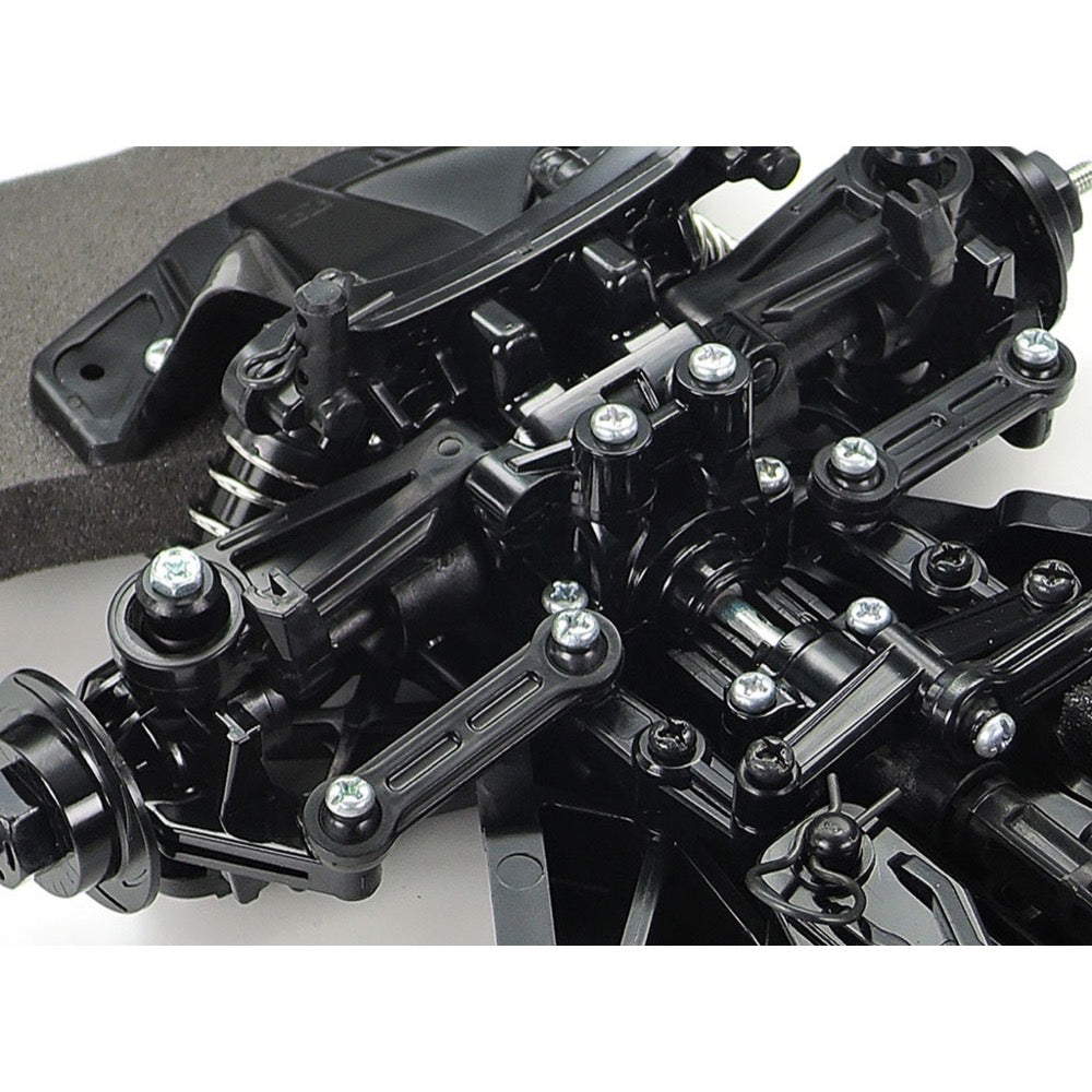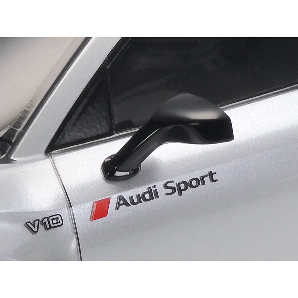 The kit features a pre-painted polycarbonate body, modeled after the 2008 Audi R8 LMS. The body is painted in Tamiya silver with tinted windows, giving it an elegant and authentic look. The pre-cut wheel arches and pre-made body mount holes make the assembly process easy and quick, especially for beginners. This level of detail in the design makes the model a perfect collector’s item and a standout on the track.