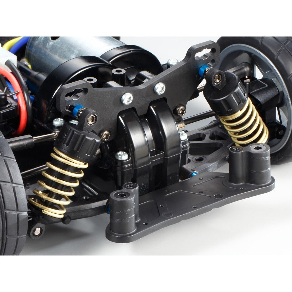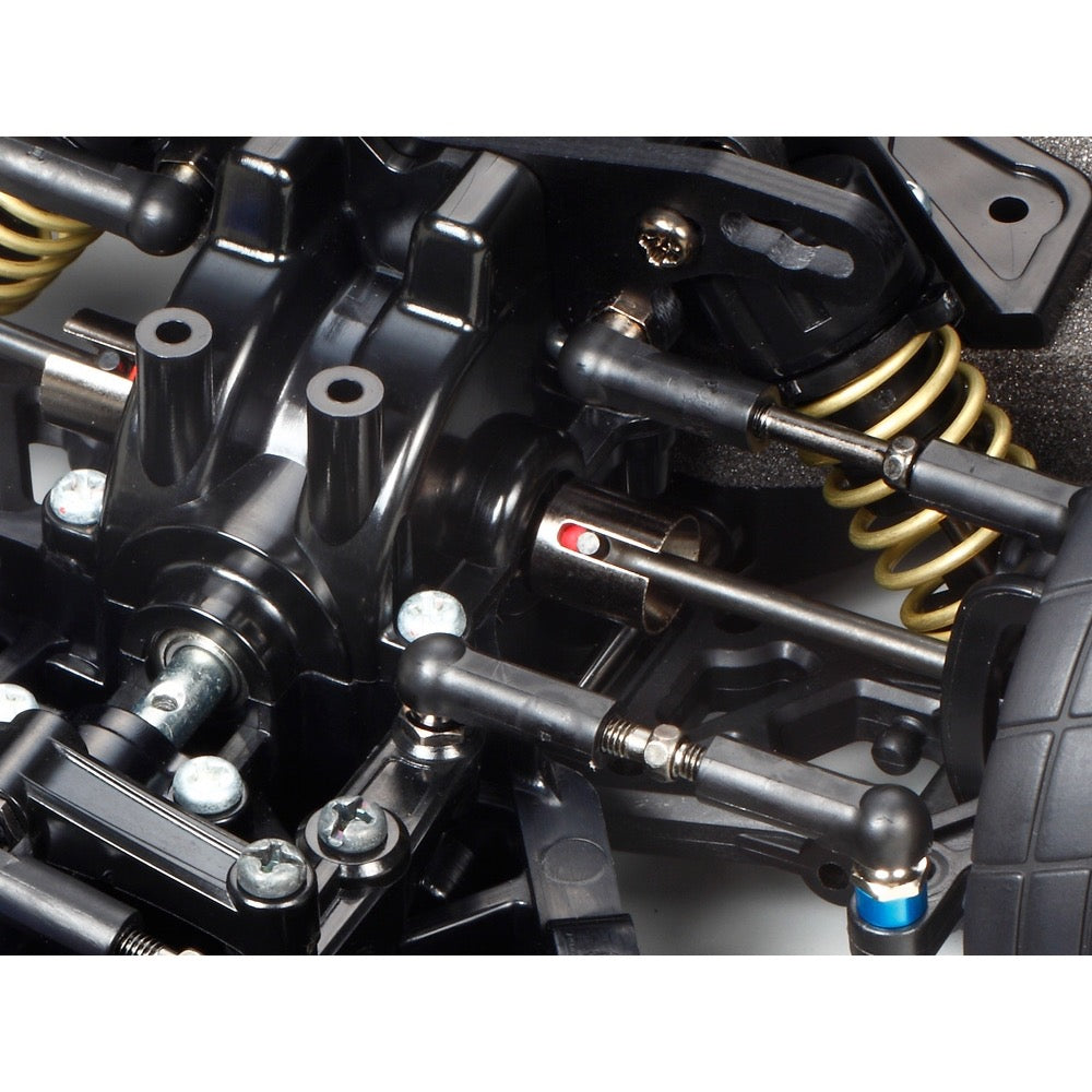 This sporty evolution of the TT-02 chassis sees the efficient shaft-driven 4WD unit given newly-designed parts and gives users the ability to make setup adjustments across the board, making it great for racing! It is equipped with long reversible suspension arms, and rigid metal suspension mounts. The rear is set up with 3°of toe-in. CVA oil dampers are attached to specially-designed 3.0mm thick FRP damper stays, with optimum damper angle and rebound stroke providing excellent road holding. Turnbuckle upper arms and steering linkage allow fuss-free adjustment of camber and front toe. Power loss is minimized by the use of full ball bearings and metal cup joints and drive shafts.