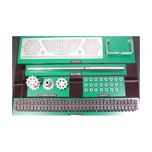 Kit includes die-cast sprockets and lathe-turned aluminum gun barrel. The double-pin tracks, which are equipped with pads made out of rubber like the actual tank, come pre-assembled. In order to obtain an even more striking feel of realism , mesh of the baskets mounted on rear of turret, and grilles on the engine compartment cooling fans have been reproduced with photo-etched parts.