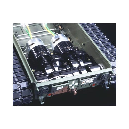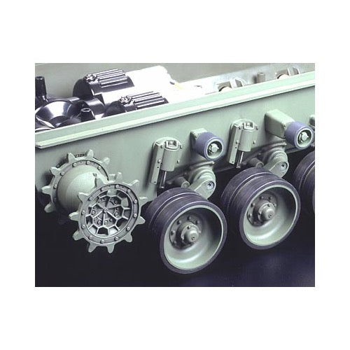 The R/C Leopard is powered by 2 high-torque Type 540 motors. A specially designed gearbox allows smooth power transmission at both low and high speeds. This system accurately imitates the transmission of the actual tank. One motor controls forward/backward movement and the other motor allows the tank to turn and rotate. Suspension comes equipped with torsion bars that give this model high mobility.