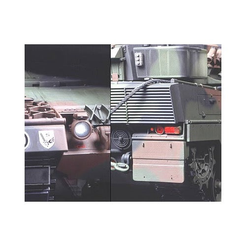 The R/C leopard 2 A6 features various workable lights such as headlights, tail lamps, brake lights, black-out lights and rotating light. Model features 7 lighting combinations, 4 for tank during combat operations and 3 during non-combat operations. Main gun and axial machinegun also flash when fired.