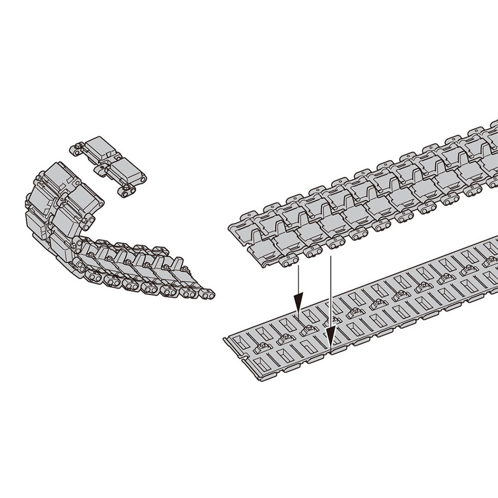 • Tracks are split into upper and lower halves. Curve sections are assembled link by link.