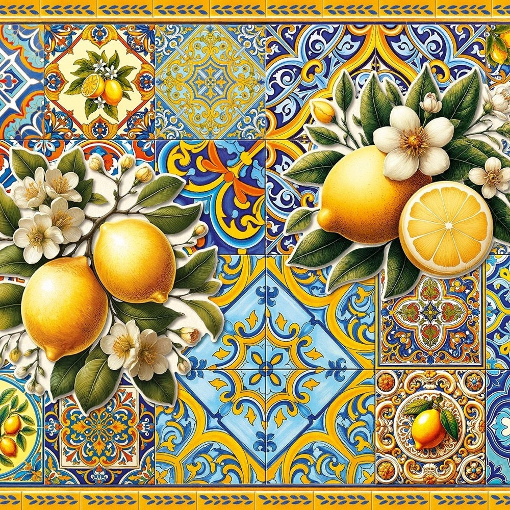 Lush lemons hang amidst delicate blossoms, resting on a mosaic of vibrant blue and intricate patterns. Each tile whispers the warmth of sunlit afternoons, the gentle hum of Mediterranean breezes, and the simple joy of nature's bounty captured in this puzzle.