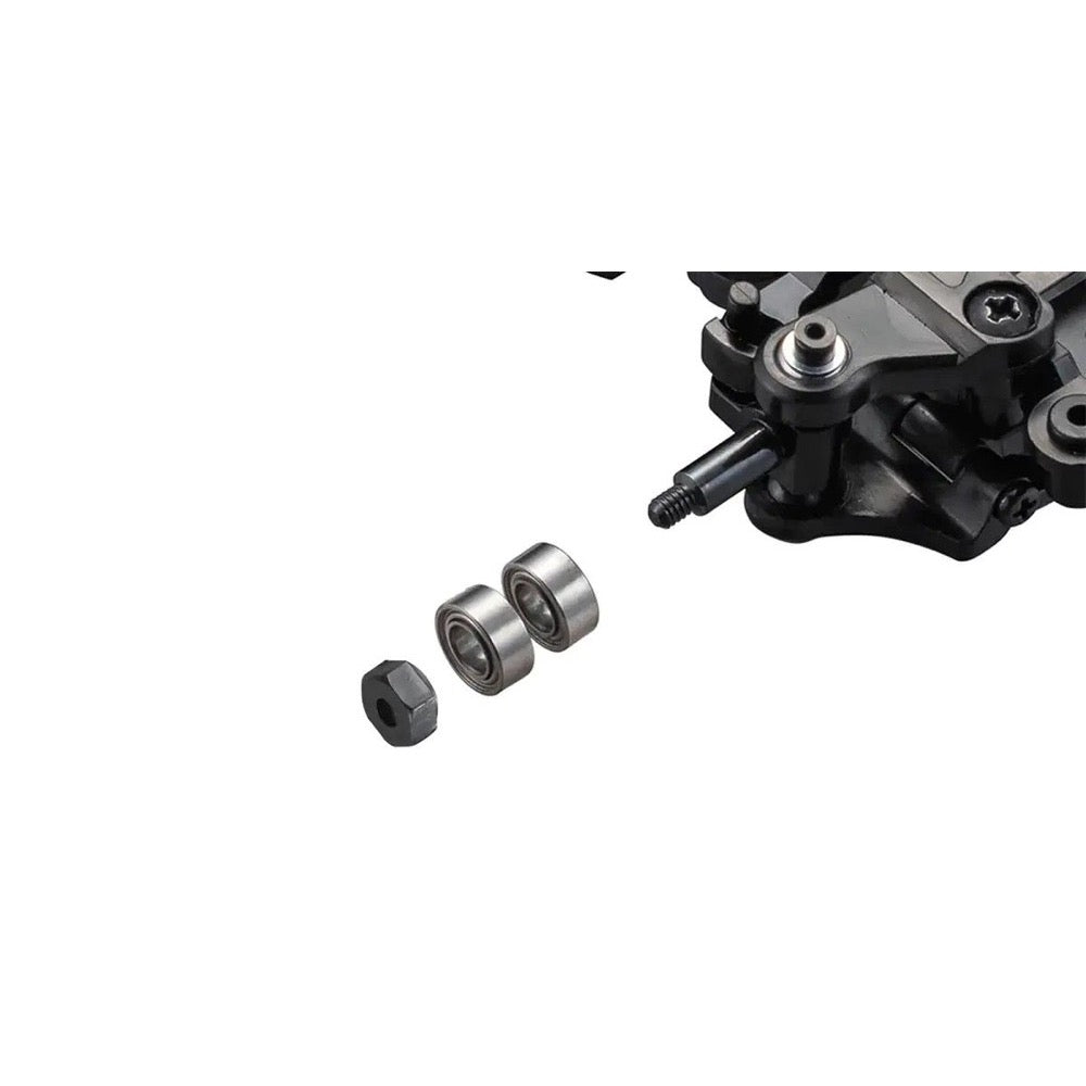 • New front knuckles with integrated kingpins reduce scrub by 1.5mm on each side compared to the MR-03, realizing sharper and more linear control. The change to 3mm inner diameter ball bearings also reduces rotational resistance.