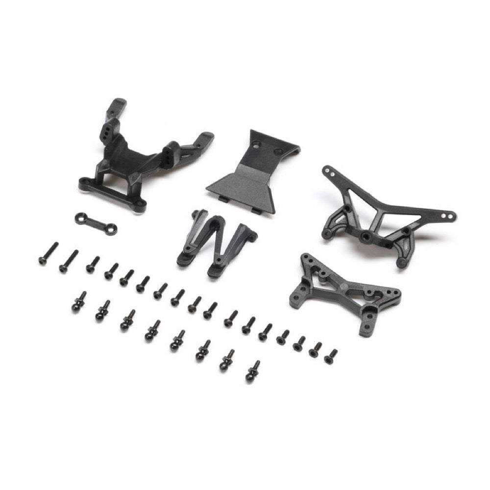This Front & Rear Towers, Bumper Set for the Losi Micro-B includes a front tower, rear tower, rear tower mount, front tower mount, front bumper, screws, and ball studs. High quality composites.