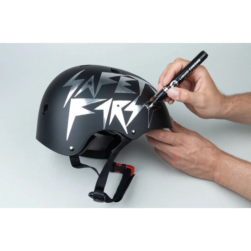 The Liquid Chrome range has been specially designed to mark Molotow's 20th birthday. The range includes three German-made pump markers which dispense a highly-pigmented, alcohol-based and permanent ink. This Liquid Chrome ink is an opaque and permanent high-gloss metallic chrome-colored ink. Suitable for indoor and outdoor use on a variety of surfaces, this ink is highly UV-resistant and very quick to dry.