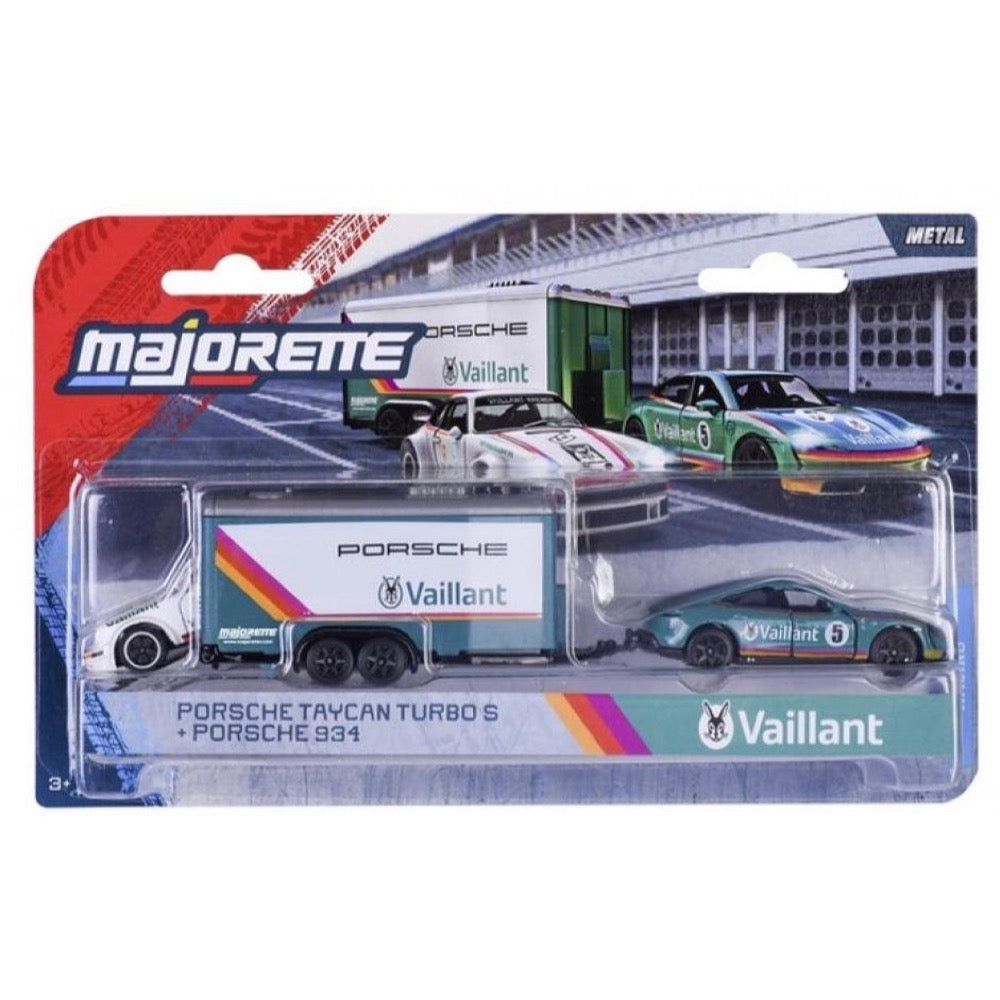 All vehicles are made of metal and equipped with freewheels, suspension, and some parts that open. The trailer can be attached to the car and opened via the tailgate, allowing the race car to be loaded and transported in style.