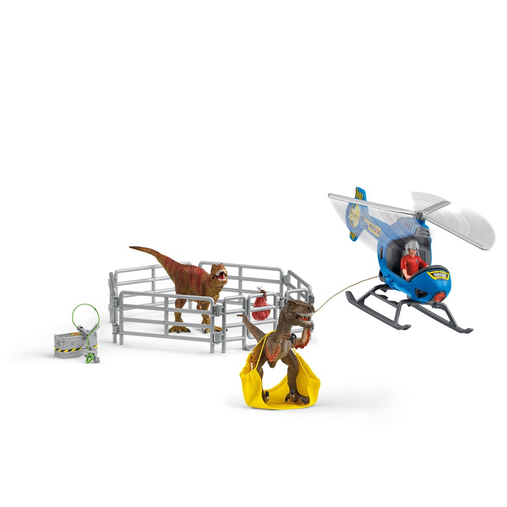 The dinosaur has injured itself. Naturally, Flynn rushes over immediately. He jumps into his helicopter, puts on his helmet and flies over the Amazon. Right there! He can see the dino! He lands and skillfully throws a rope around the long neck of the prehistoric giant. That way he can take a closer look and examine it. Flynn leads the dino to the transportation bag attached to the helicopter and flies back. When he arrives at the camp, he first takes the dinosaur to an enclosure and gives it a juicy piece of meat to eat. Flynn will soon nurse it back to health!