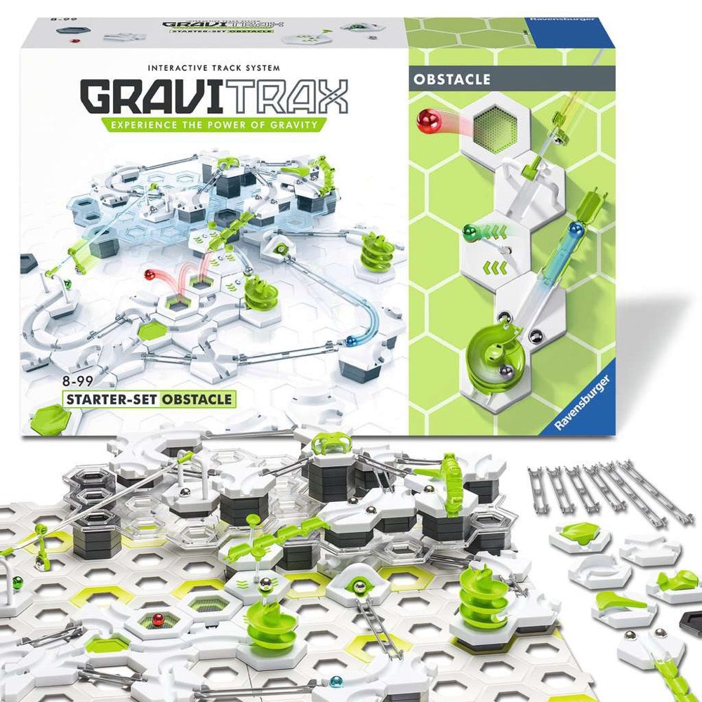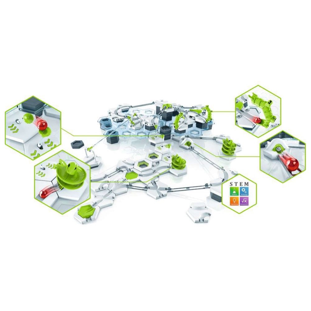 GraviTrax is a unique marble-run system featuring hexagonal risers and track tiles that simply fit and stack together, rail-tracks that hook into place, and stunt pieces that add exhilarating twists, turns, jumps, and surprises.