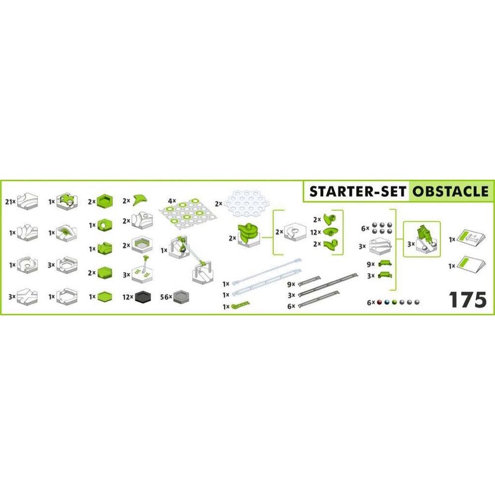 1 Instructions, construction plan booklet, 4 base plates, 2 transparent levels, 6 balls, 56 large height tiles, 12 small height tiles, 2 green angled height tiles, 21 curves, 3 junctions, 2 switches, 1 3-in-1 block, 1 vortex, 1 launch pad, 1 extra-long narrow plastic tracks, 1 extra-long slow plastic tracks, 3 long plastic tracks, 6 medium plastic tracks, 9 short plastic tracks, 3 length-adjustable bridges, 1 magnetic cannon, 3 transfers, 2 trampolines, 1 zipline, 2 spirals, 1 finish line, 4 basic tiles, inserts for basic tiles: 2 catchers, 1 freefall, 1 splash, 1 landing