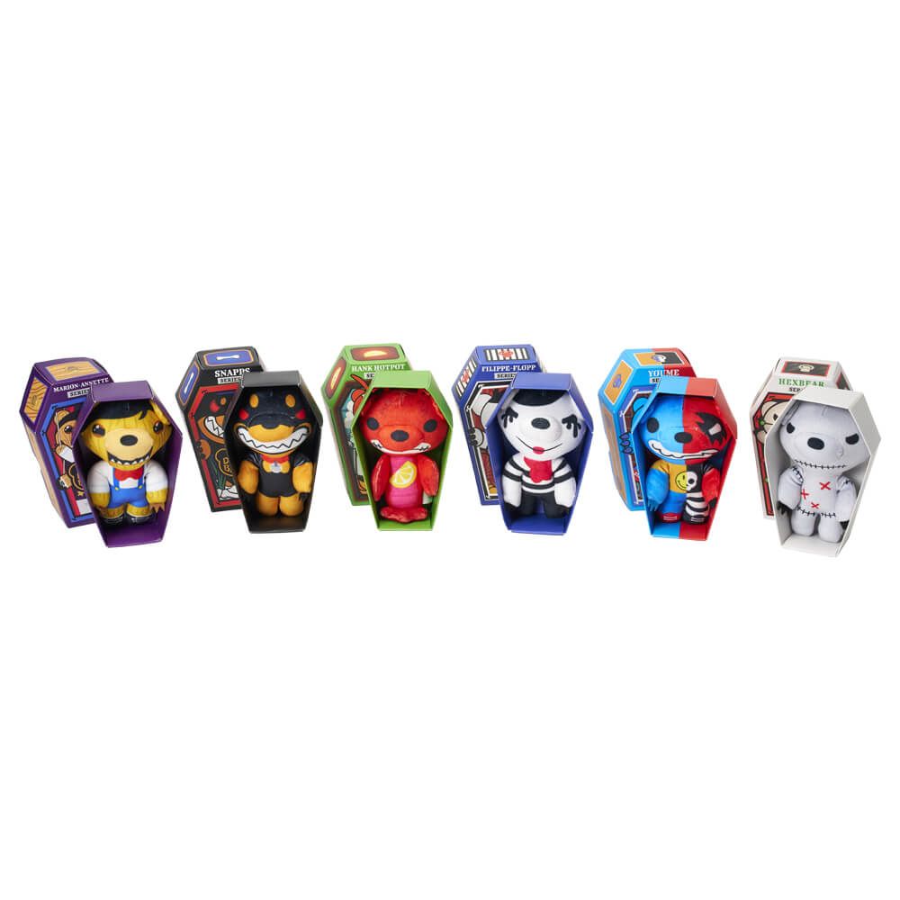 These 14cm Deddy Bears soft toys come presented in coloured Deddy Bear coffins, complete with a death certificate and character bio outlining the date of death, each bear's distinct smell, likes and weaknesses. There are six characters in this assortment, sold in a counter display unit of 12 pieces. Collect all six Hank Hotpot, Youme, Hexbear, Marion-Annette, Snapps, Filippe-Flopp.