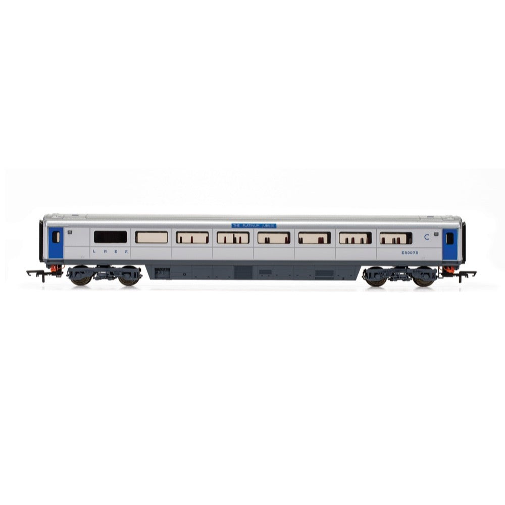 Running with the Platinum Jubilee HST units, this coach reimagines what the ageing Mk3 coaches may have looked like in this celebratory Platinum Jubilee year under the old LNER. Full trains of these could have been used to commemorate such an occasion had nationalisation simply not happened. In a Platinum Jubilee silver with blue trim livery with re-purposed destination boards, the six First Class and two First Class Restaurant sliding door Mk3 coaches would indeed make a never to be forgotten image while being pulled along the East Coast Main Line at high speed. The sleek lines combined with more than a salute to the art deco style of the 1937 ‘Coronation’ train, plus the wonderful opulence and style such a service offered, brings fanciful imaginings into reality, if only in model form. This coach is numbered ER0072, in celebration of the Queen’s 20th year on the throne.