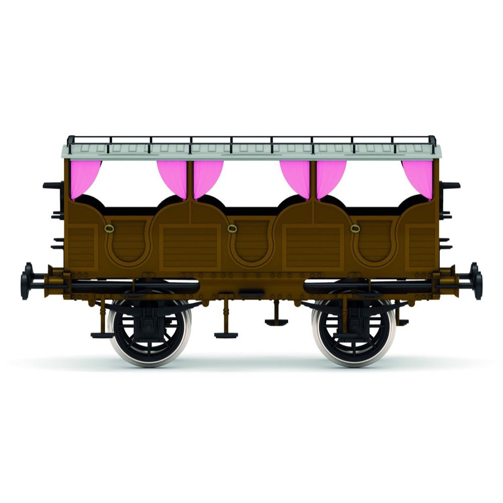 The second-class open-topped coach model sports an L&MR brown livery. The accessory bag contains two chain couplings.