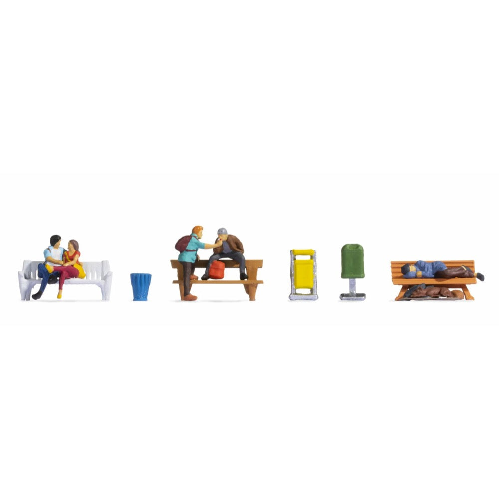 The "People on benches" figure set for H0 gauge contains five people, a dog, three different garbage containers and three benches. Park scenes in particular can be designed realistically with this set.