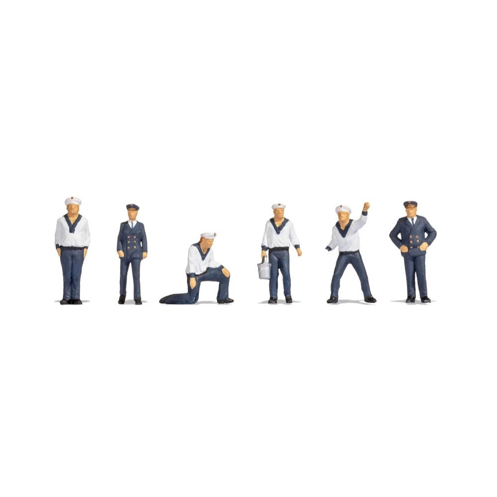 The set in TT gauge includes six male sailors. Three of them wear typical work clothes consisting of dark trousers and a white sweater with a dark band on the sleeves and collar. In addition, a white sailor's cap sits on their heads. The two other sailors are wearing a dark suit with a shirt and tie. One of the sailors holds up his hand while the others kneel or hold a lantern to provide enough light. Two of the men are watching the action and another is doing a patrol of the ship.