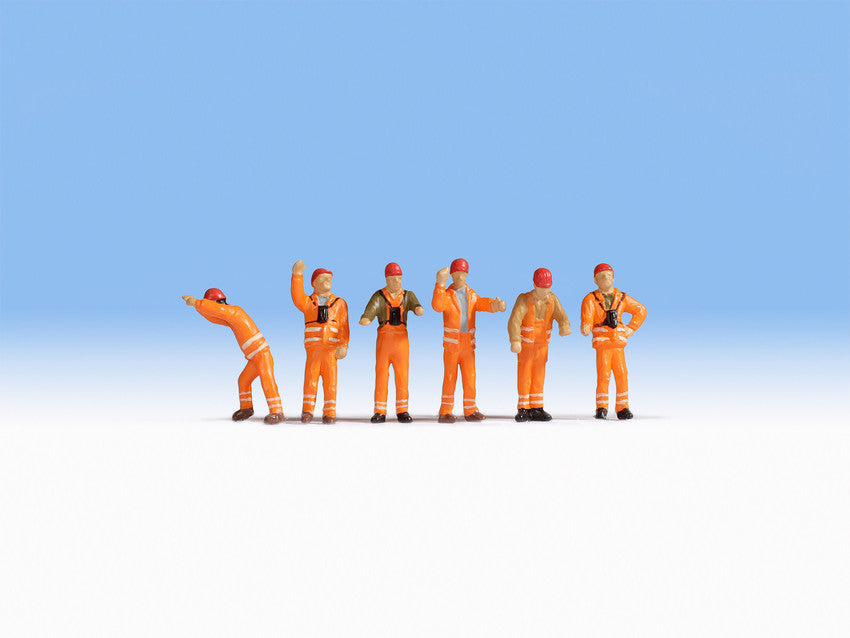Shunters should not be missing on a model railroad layout. Working busy they care for safety on the rails for trains and passengers. They ideally match station scenes and other NOCH railway figures like Railway Construction Group and Track Workers.