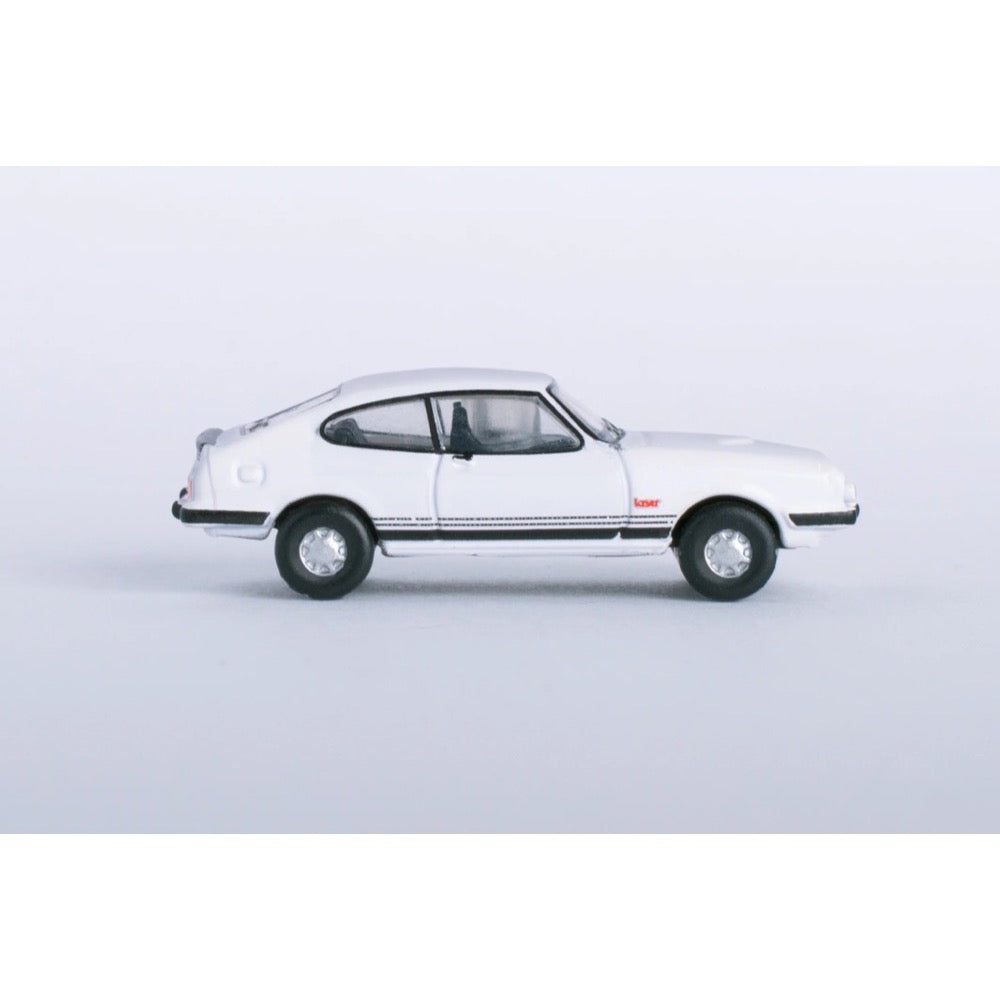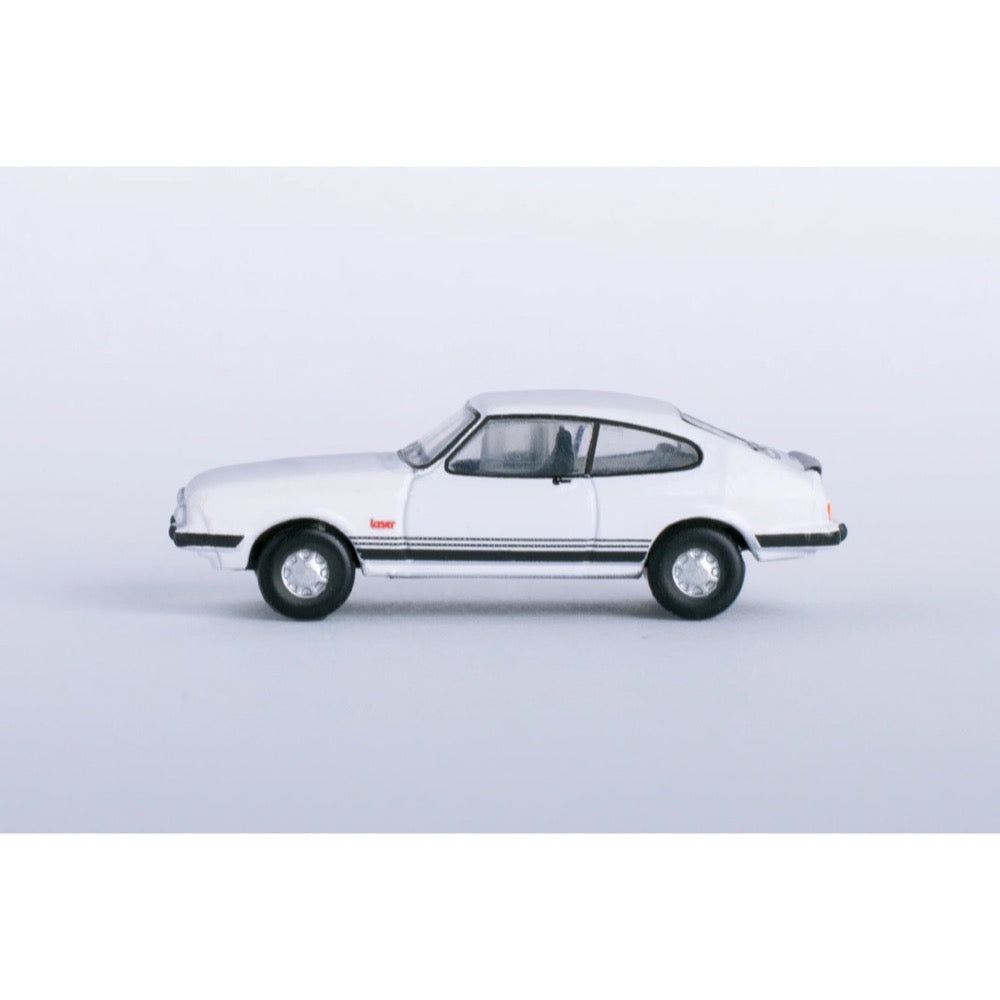 Released previously in 1:76 scale in the same colourway, our N scale Ford Capri Mk 3 Laser 2.0L in Diamond White is an exact replica in every way. It also incorporates many of the features of the ‘real thing’ such as spoked wheels, body coloured door mirrors and headlamp surrounds.  Our 1:148 model is decorated in pure white, including the radiator grille and features the Laser logo printed in red across the boot and behind the front  wheel arch.  A bold black double stripe runs along each side of the body and the blue and white Ford badge is embedded into the radiator grille and also printed on the boot. Our Mk 3 Laser Capri is registered C99 UUE.