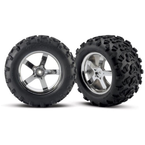 Tires & wheels, assembled, glued (Hurricane chrome wheels, Maxx® tires (6.3" outer diameter), foam inserts) (2) (fits Revo®/T-Maxx®/E-Maxx with 6mm axle and 14mm hex)