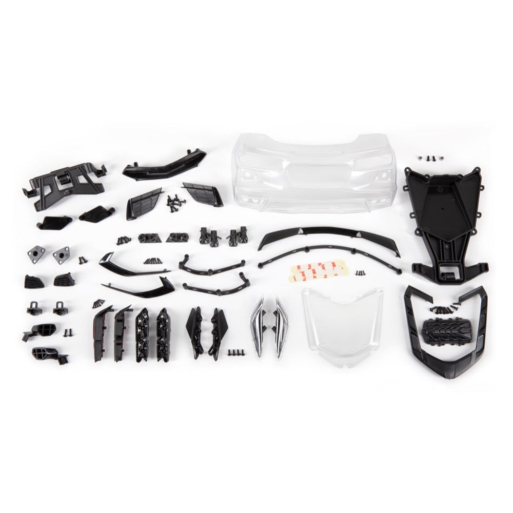 Body, Chevrolet Corvette Stingray (clear, trimmed, requires painting)/ decal sheet (includes side mirrors, spoiler, grilles, vents, hardware, & clipless mounting)