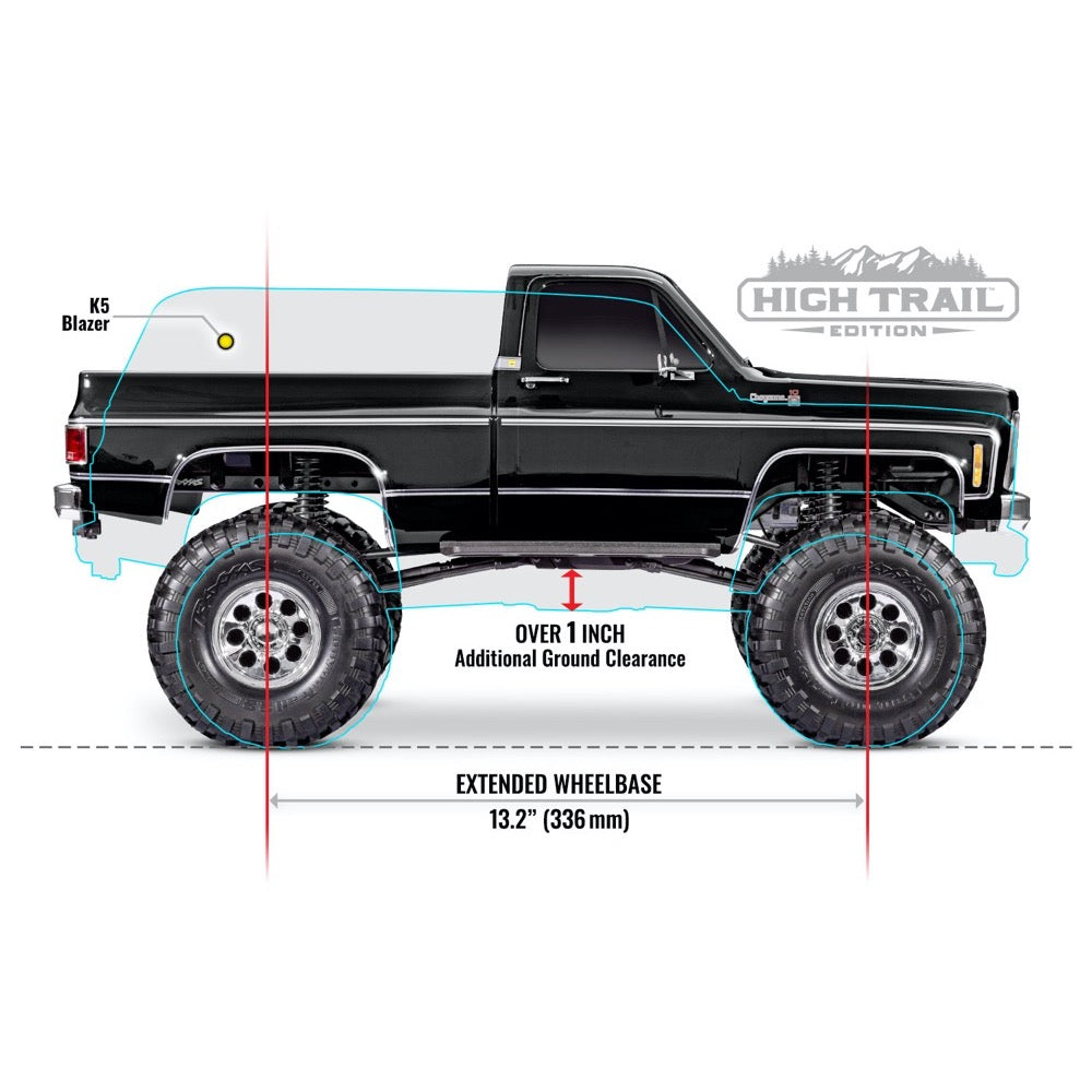 Traxxas elevates scale adventure with the lifted TRX-4® Chevrolet® K10 High Trail Edition. Thanks to its factory-installed Long Arm Lift Kit and oversize tires, the highly detailed K10 replica body stands over an inch taller than our standard TRX-4. The K10’s extended wheelbase further enhances the TRX-4’s already legendary off-road capability for even more fun on the trail. The TRX-4 High Trail Edition is the perfect vehicle for the driver who wants it all: extreme all-terrain capability, stunning scale looks, and Traxxas-Tough™ durability.