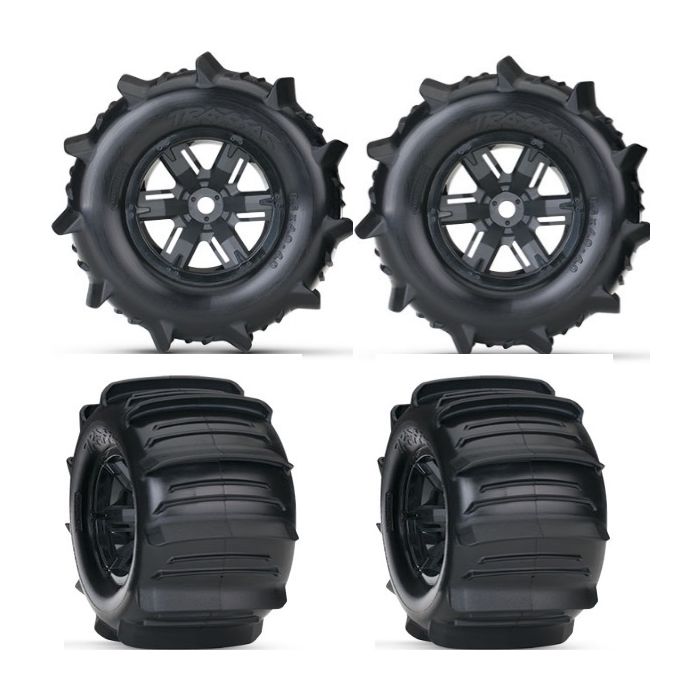 Traxxas paddle tires offer unbeatable traction in sand, snow, mud, or any loose surface. Paddle tires feature outrageously strong scoops combined with strengthening ribs and TSM-rated glue joints to provide a whole new dimension in traction and off road fun. Paddle tires come mounted and pre-glued with foam inserts on tough black six-spoke wheels for no-hassle, out-of-the-box bolt-on traction.