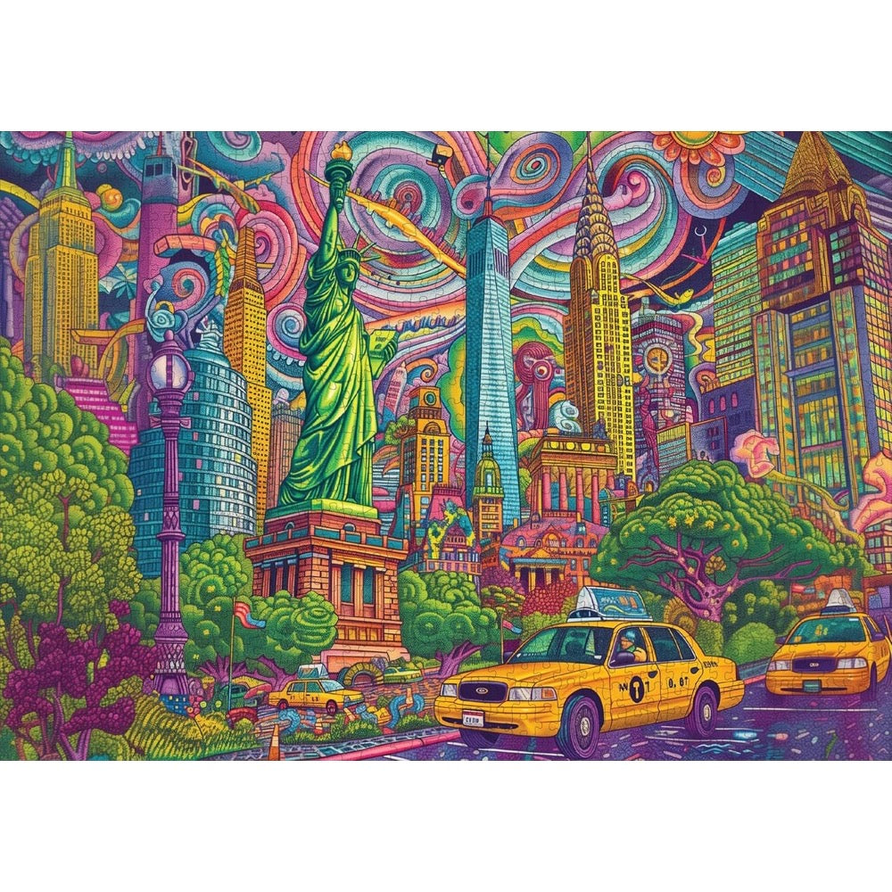 Step into the wonder of New York City with the Mystical Manhattan 1000-piece jigsaw puzzle, a challenging and creative puzzle experience. This puzzle captures the iconic skyline of Manhattan, featuring landmarks like the Empire State Building and the Statue of Liberty, surrounded by vibrant patterns that reflect the city’s energy.