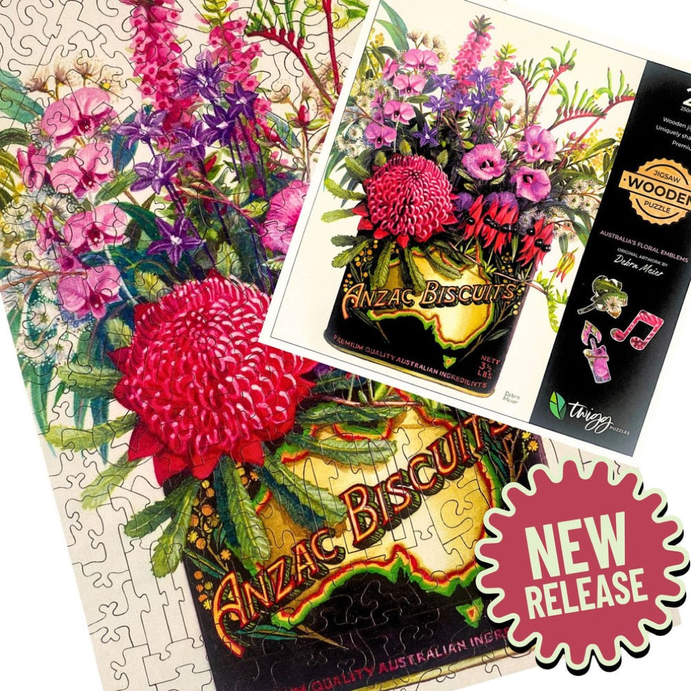 This is original artwork from Debra Meier and is her watercolour tribute to all of Australia’s floral emblems of our nation’s different states and territories in a Vintage Anzac Biscuits Tin.