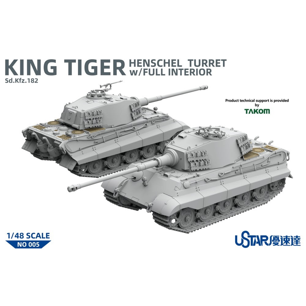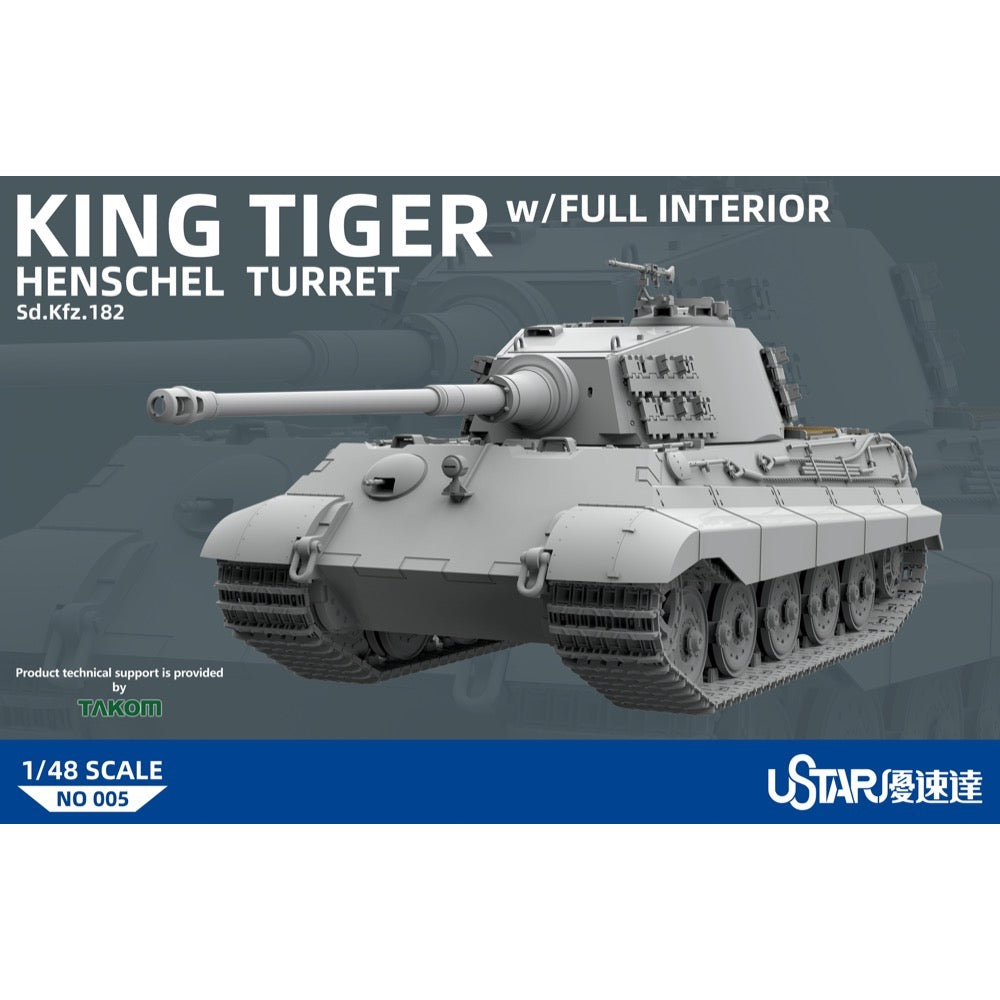 This model kit from Takom of the legendary King Tiger tank features the Henschel turret and a fully detailed interior! Photo-etched parts and Zimmerit decals are included.