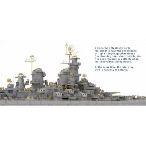 This kit from VeryFire is a completely new mold! The U.S. Navy battleship Missouri is the third Iowa-class battleship, and is named after the 24th state of the United States; she is the fourth ship to bear the name. Launched in 1944, the Missouri was the 63rd battleship built by the U.S. Navy; she participated in the Battle of Okinawa during World War II, and on September 2, 1945, the Japanese Instrument of Surrender was signed on her deck. She retired in 1955 after the Korean War; in 1986, she added state-of-the-art weapons and electronic devices such as the BGM-109 Tomahawk, Harpoon, and Phalanx CIWS and was put back into service. She took part in the Gulf War in 1991, and in 1992 was retired again; she has been preserved as a memorial ship in Pearl Harbor, Hawaii since 1999.