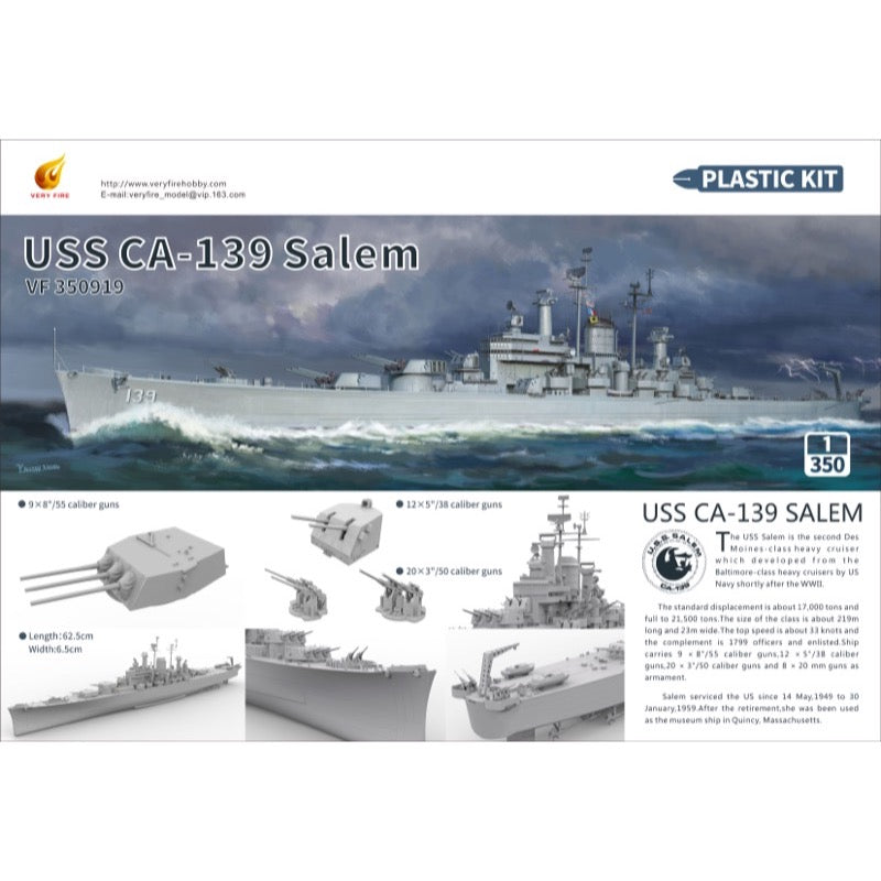 The third USS Salem (CA-139) is one of three Des Moines-class heavy cruisers completed for the United States Navy shortly after World War II. Commissioned in 1949, she was the world's last heavy cruiser to enter service and the only one still in existence. She was decommissioned in 1959, after serving in the Atlantic and Mediterranean. She is open to the public as a museum ship in Quincy, Massachusetts.
