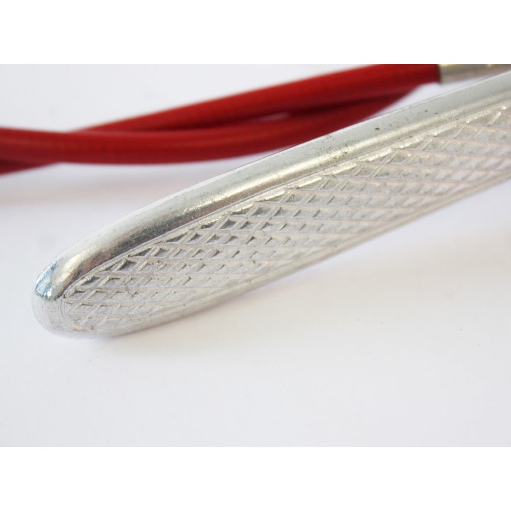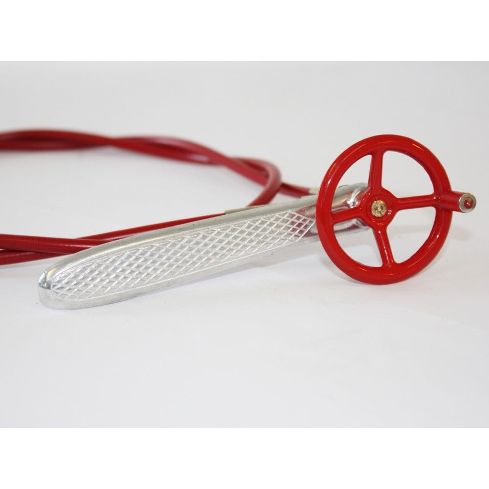 A handy metal handle and a sturdy ground pull make it easy to operate. The control is clamped onto the steering wheel of the steam roller or steam tractor using a spring.