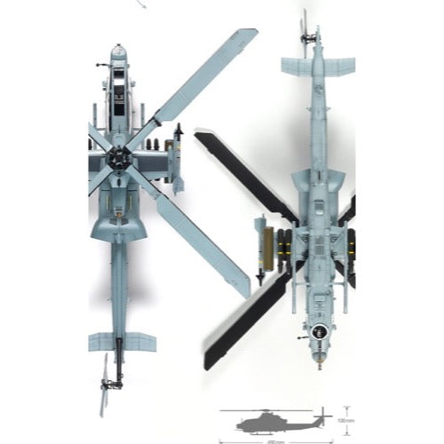 This kit of the USMC AH-1Z Shark Mouth is the newest upgraded variant of the AH-1 attack helicopter used by USMC. With a 20mm rotary cannon, AGM-114, and AIM-9 missiles, as well as two types of rocket pods. The cockpit of this kit is accurately detailed with panel lines and rivets that appear as they do on the real thing. This kit comes with plastic parts to build one model, photo-etched parts and masks for the canopy.