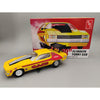 This kit is packed full of features including a custom body shell flips open to show the lightweight dragster-type tubular frame, optional wing, a supercharged “Donovan” 417 HEMI engine, Hilborn fuel injector, “Zoomie” exhaust headers, “Cragar super trick” wheels, giant pad-printed M&H Racemaster slicks with optional wheel discs, and “wheelie” casters. With an expanded set of colorful water-slide decals with multiple options. The kit is all wrapped up in authentic vintage-style packaging.