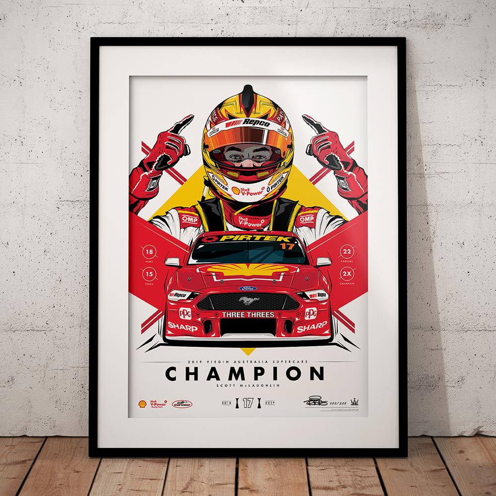 Limited edition illustrated print celebrating Scott McLaughlin’s 2019 Championship win with Shell V-Power Racing Team. Standard Edition.