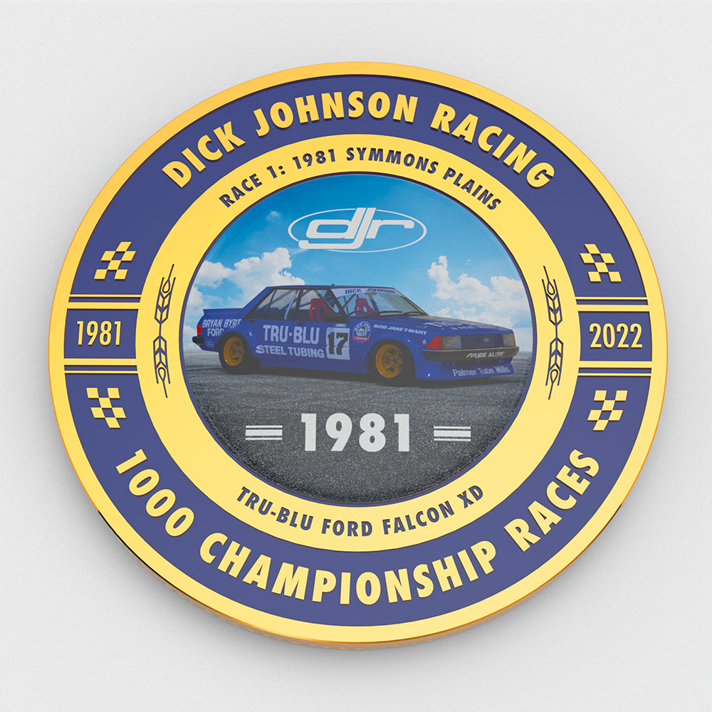 This two sided gold plated metal medallion celebrates the 1st and 1000th championship races and cars for the team. Dick Johnson's iconic Tru-Blu Falcon XD on one side and the incredible Shell V-Power Racing Team Ford Mustang GT's being driven by Anton De Pasquale / Tony D'Alberto and Will Davison / Alex Davison at the 2022 Repco Bathurst 1000 is featured on the other.