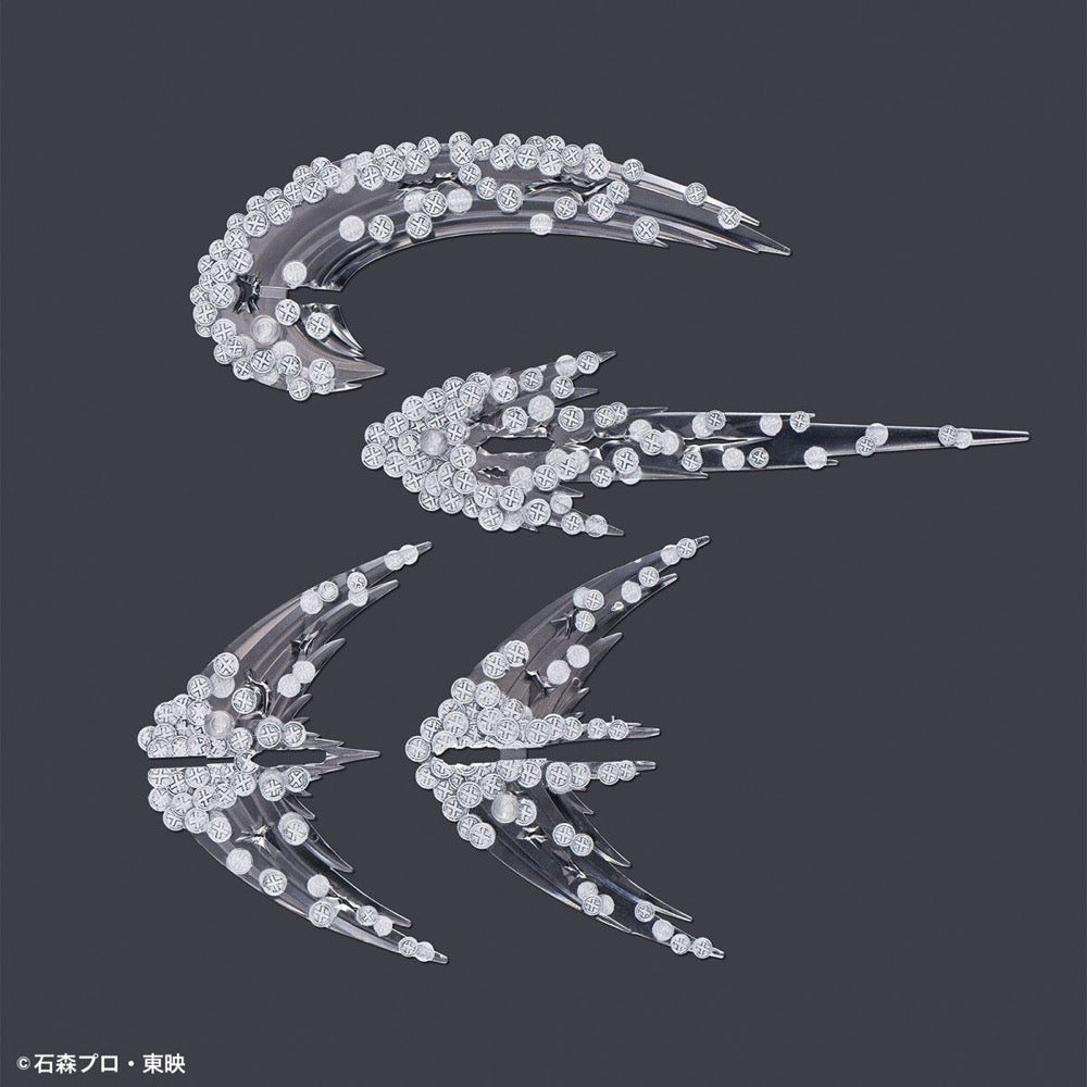 Kamen Rider OOO is equipped with the biggest feature of the combo-change gimmick; his chest crest, which would be difficult to do in separate colored parts, is reproduced with a tampo-printed part for accuracy. He comes with a full range of accessories such as Traclaws, Medajaribur and Batter Legs! Three Cell Medals that can be attached to the Medajaribur are also included.