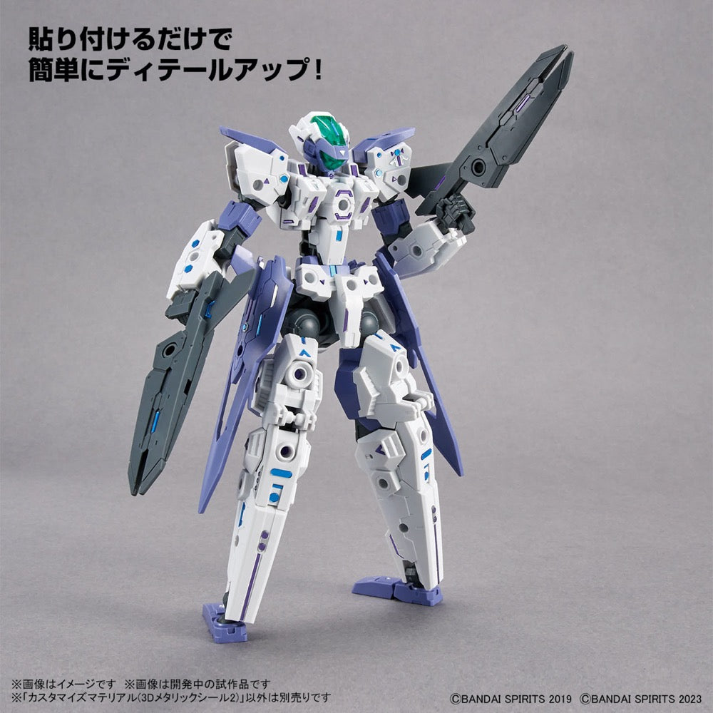 Bandai's official material parts brand "Customize Material" brings us the second selection of 3D metallic seals, made especially for 1/144-scale model kits such as "30Minutes Missions" (30MM) mecha! These plastic stickers have a three-dimensional feel, with a metallic layer sandwiched in between; it comes in three vibrant colors: purple, blue and silver. You can easily add accents to your favorite model kits by simply sticking them on; they can help create sensors, lenses and more.