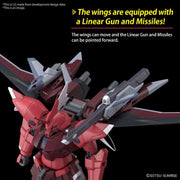It's equipped with the "Seed Action System" internal structure that specializes in reproducing impressive action poses! The wings are movable, allowing the linear cannon and missile launcher to be held in front. The wide range of motion of the shoulders allows for smooth holding of the railgun with both hands. The Beam Naginata for close combat comes with a grip for storage, and can be mounted on the waist. A beam shield using polarization molding is included; you can recreate the shield's storage and deployment modes with parts replacement. Although this mecha is bulky, it's flexible enough to get into a natural kneeling pose. And since the parts are molded in color, you'll get a great-looking result just by assembling it.