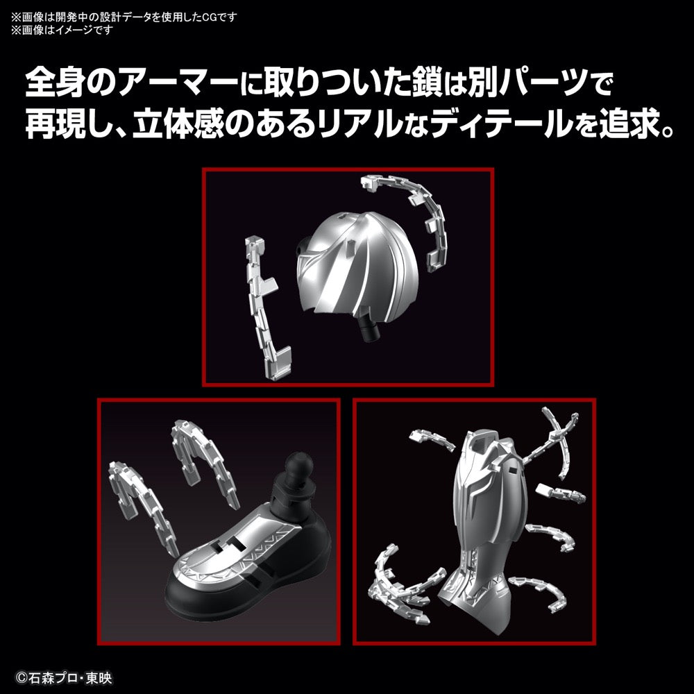 In order to recreate Kiva's unique poses, the movable axes of the waist and hip joints have been rebuilt. By moving the exterior of the waist in conjunction with the internal parts of the hip joint, a wide range of movement is achieved in the legs. The suit features a mirror polish and extra finish, with the entire body's details expressed by varying the roughness of the surface. The chains attached to the body armor are separate parts for a heightened sense of realism; you can also reproduce the Hell's Gate open state of the right leg with parts replacement. The Kivat Bat III can be attached and detached from the belt, and a special base is included to display it floating. A variety of interchangeable hands and a Figure-Rise Effect base are included too