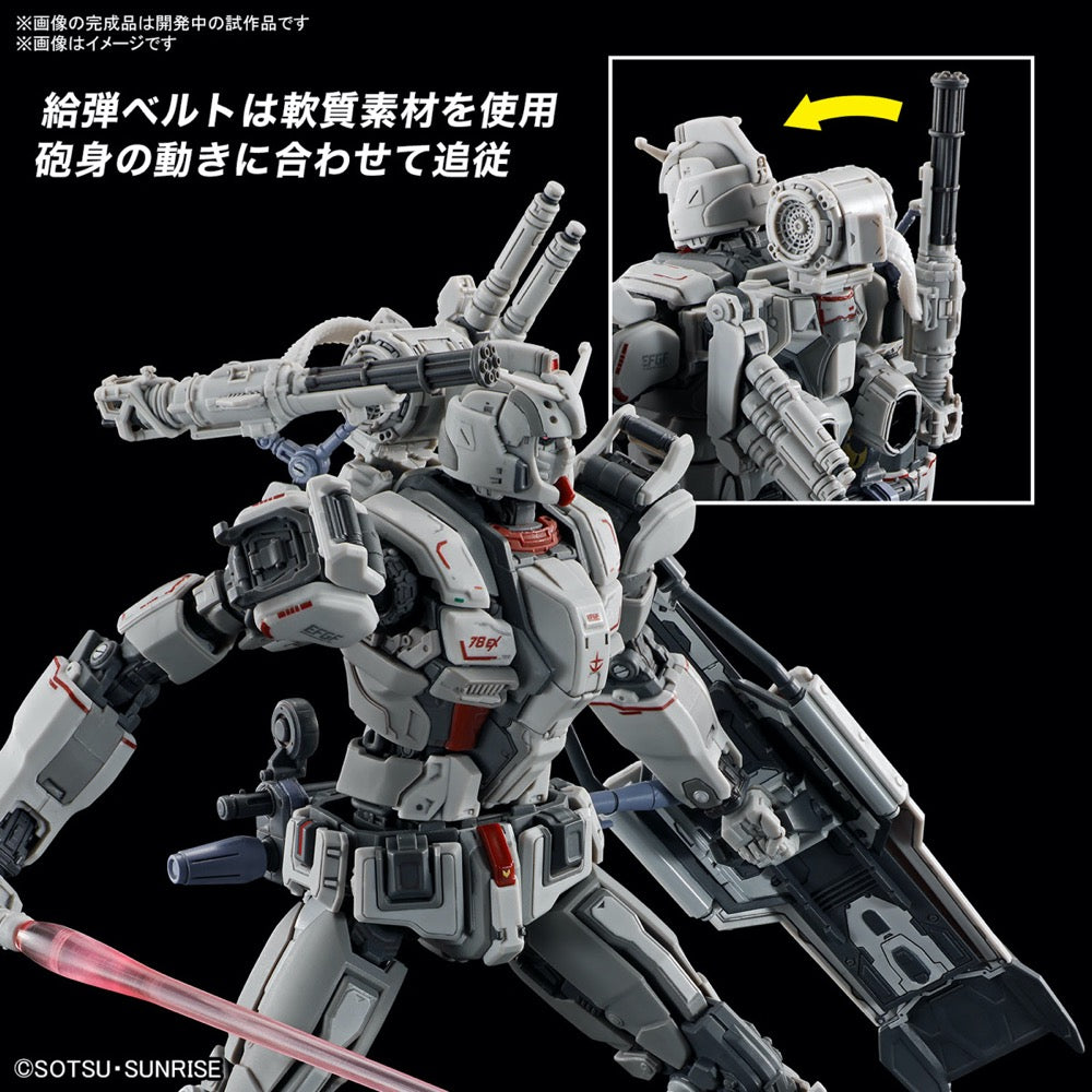 • The characteristic precise details and shapes on the Gundam's body are reproduced with the parts configuration unique to plastic models; the ammunition belt connected to the shoulder Gatling uses soft parts to allow flexible movement.