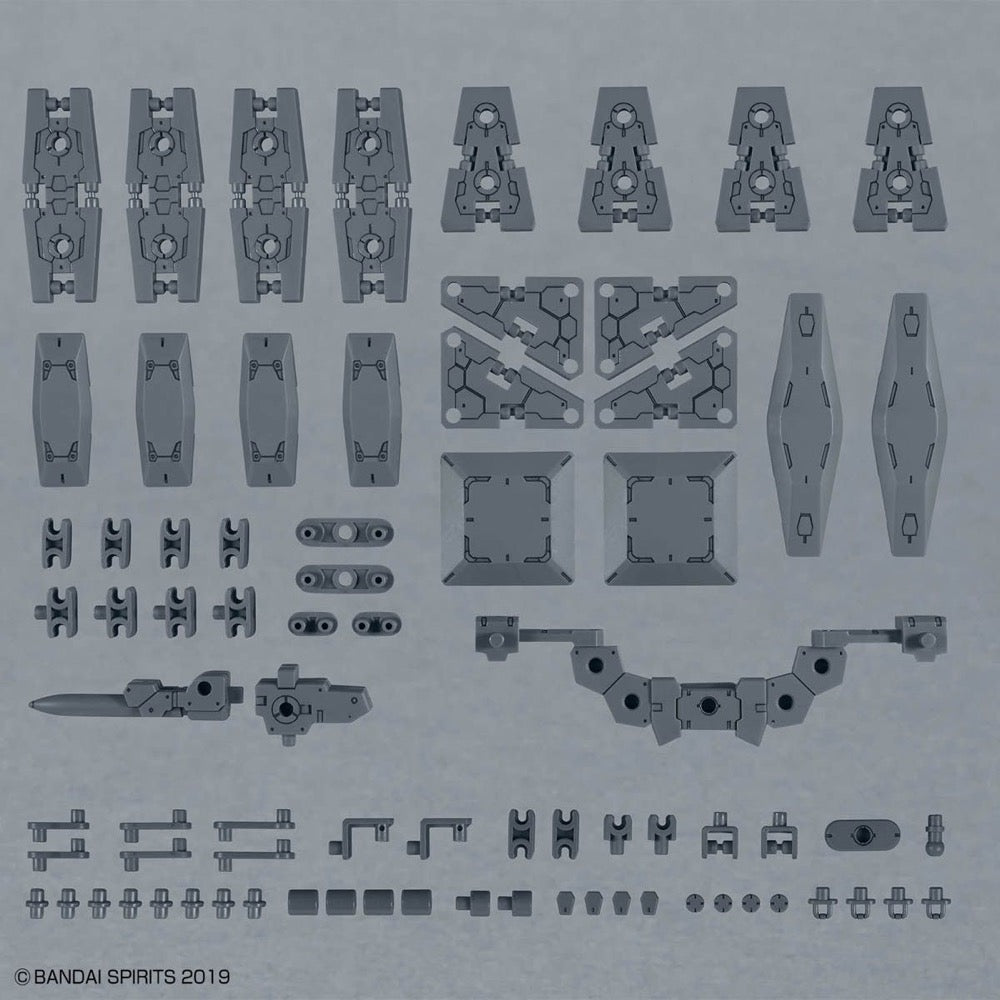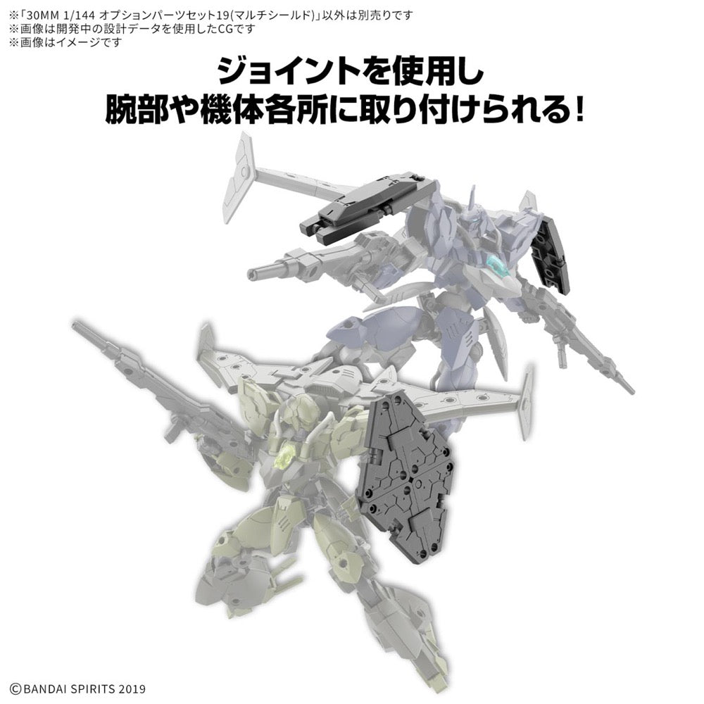 Bandai adds a freely reconfigurable shield parts set to their "30MM (Thirty Minutes Missions) Option Parts Set" series! Create your own original shield by combining the parts in any way you choose! By using various joint parts, the shield can be attached to the unit in various ways. A movable backpack and small pile bunker are included to which the shield can be attached; the backpack can be moved on each joint axis. The small pile bunker can also be attached to the shield; the shield can be assembled into various sizes to suit the unit, and it can also be attached to the arms and various other parts of the unit using joints. It can be used with the new Roundnova units, too!