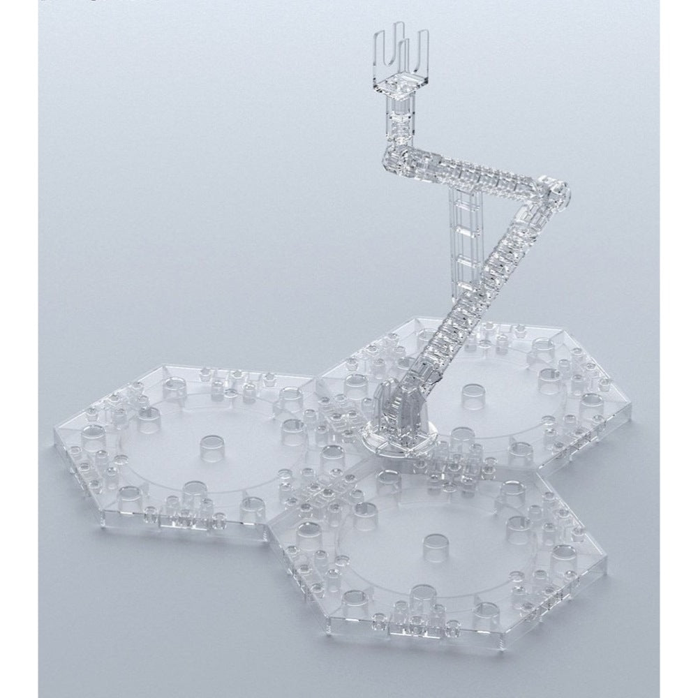 This new base from Bandai features three bases, each 2.8cm by 2cm, that can all interlock to form one base, each with lots of openings for support poles. A long support pole 11cm in length is included, as are joint parts and other support parts. Perfect for larger kits like Master Grades and RE/100! This version is clear.