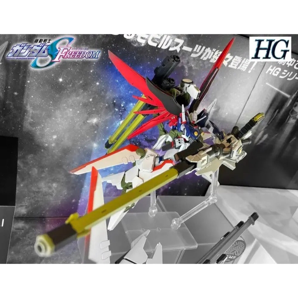 The included HG Destiny Gundam Spec II reproduces the coloring of the setting with a molding color. Clear-molded parts such as "Wings of Light", "Effects for Palma Fiokina", "Beam Shield", and "Beam Boomerang" are also included. In addition, weapons for the Destiny Gundam such as the "Arondite Beam Sword" and the "High-Energy Long-Range Beam Cannon" are also included.