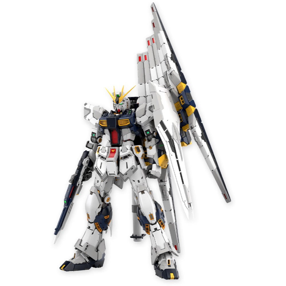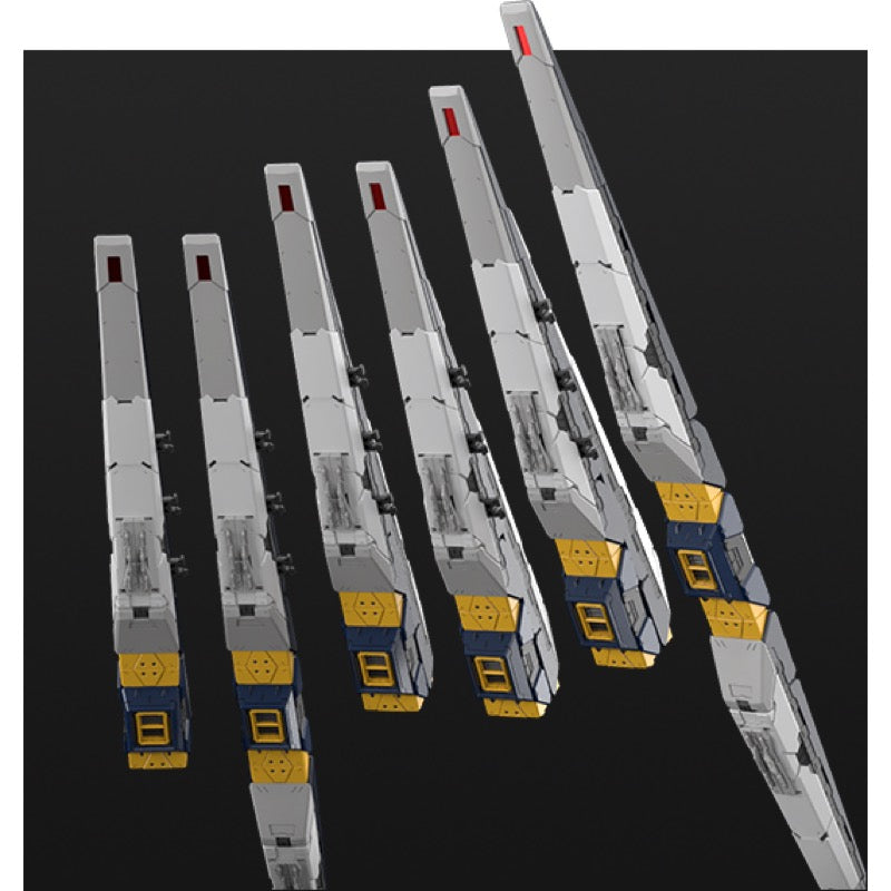 The Nu Gundam's iconic fin funnels — its offensive and defensive psycommu weaponry — are fully recreated with complex articulation. These large-scale parts can slide and rotate to switch between three display modes and can be firmly mounted using custom support arms.